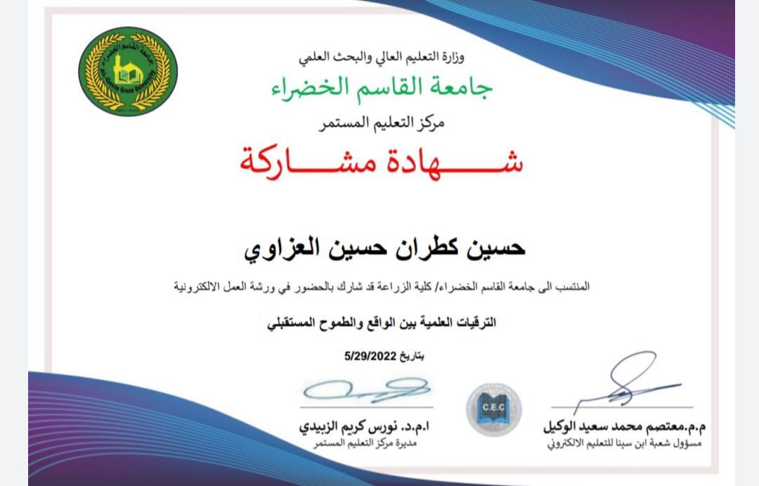 شارك السيد حسين كطران حسين من قسم المحاصيل الحقليه - كلية الزراعة/جامعة القاسم الخضراء الورشة العلمية الالكترونية بعنوان ( الترقيات العلمية بين الواقع والطموح المستقبلي ) التي نظمتها جامعة القاسم الخضراء - مركز التعليم المستمر...