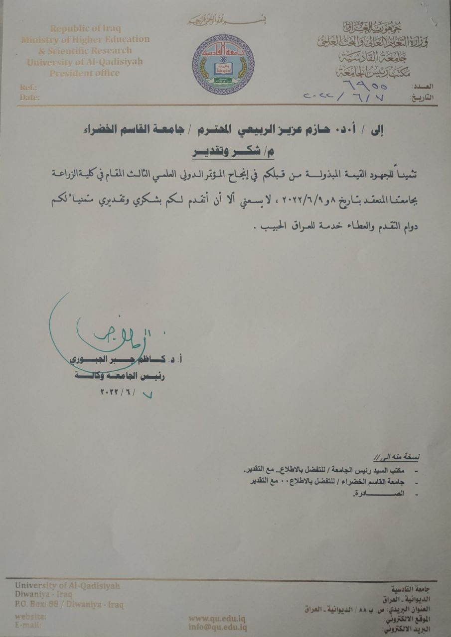 حصل الاستاذ الدكتور حازم عزيز الربيعي التدريسي في كلية الزراعة قسم علوم التربة والموارد المائية على شهادة تكريم وكتاب شكر وتقدير من قبل رئيس جامعة القادسية وذلك بعد مشاركته في افتتاح اعمال المؤتمر الدولي الثالث للزراعة والبيئة والتنمية المستدامة وإلقاء محاضرة بعنوان ( Sustainability and Biology of Ecosystems)