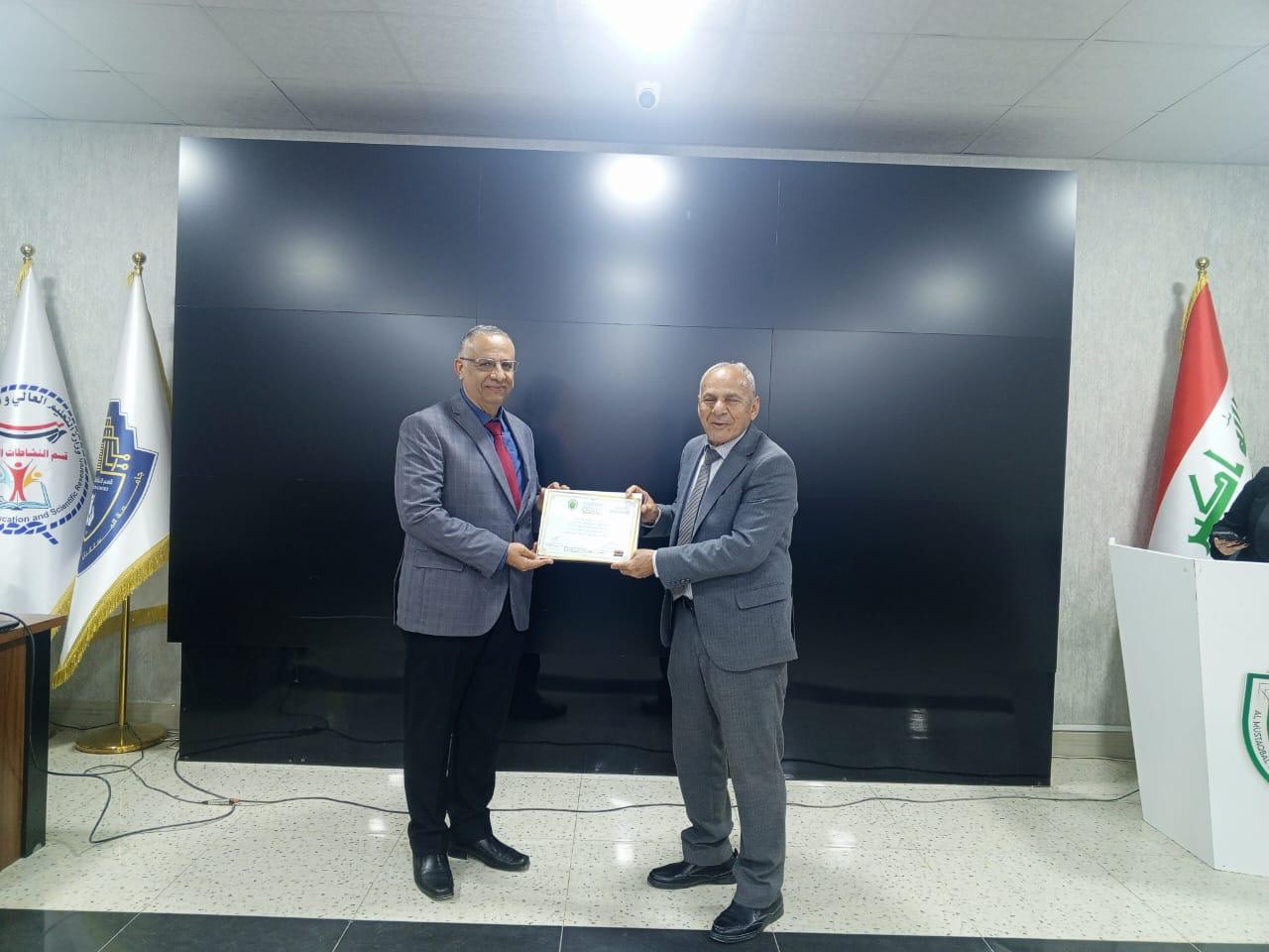 شهادة تقديرية لتدريسي في كلية الزراعة بجامعة القاسم الخضراء عن تقييم بحث علمي