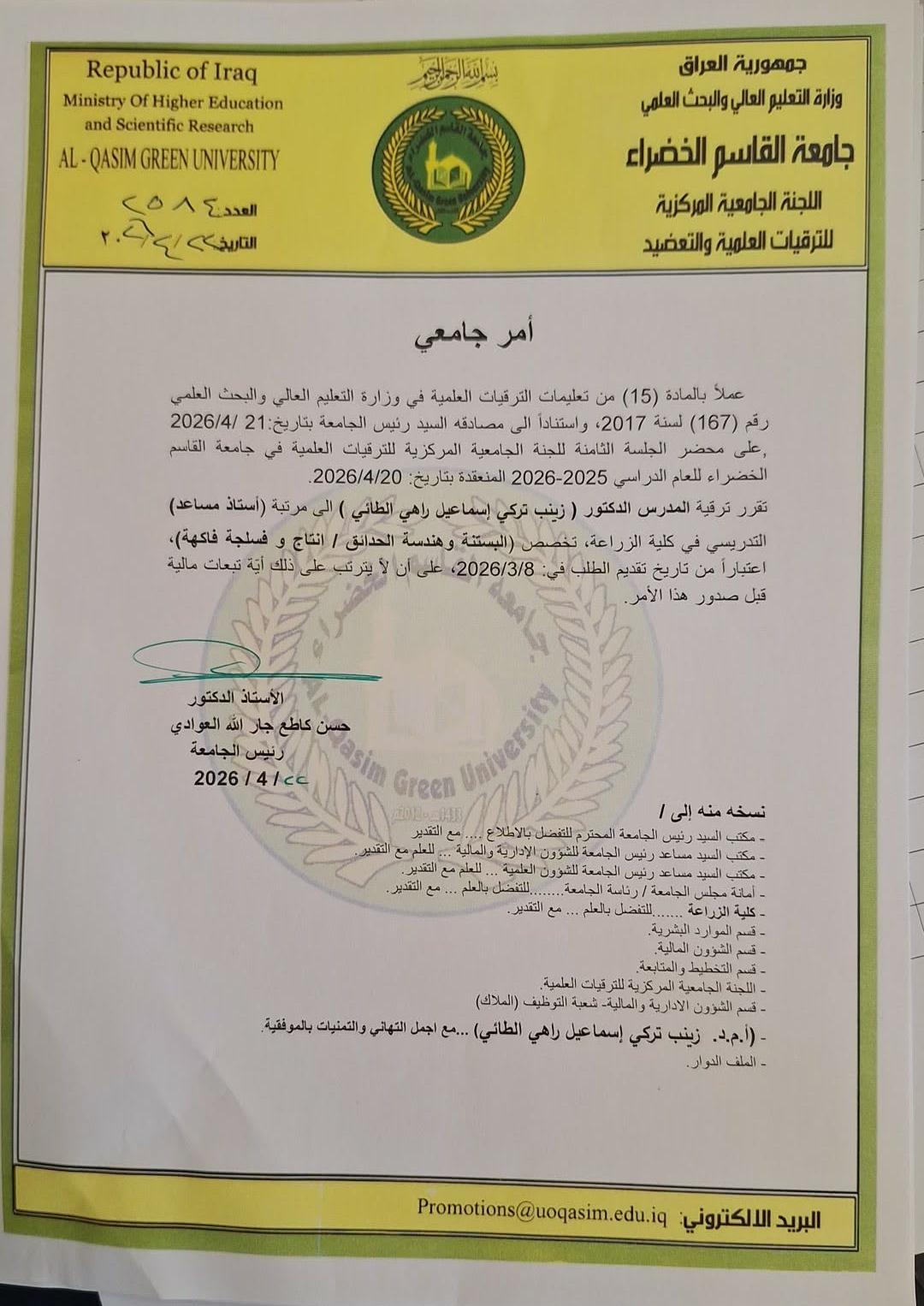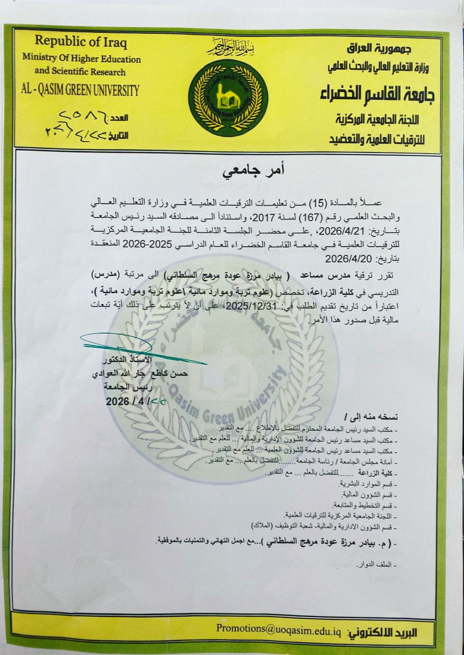 ترقية علمية في كلية الزراعة – جامعة القاسم الخضراء